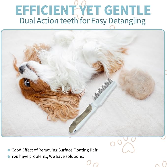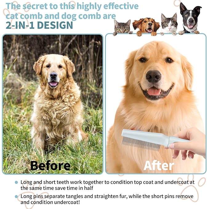 Ropo Pet Grooming Comb for Dogs and Cats, Flea Comb, Long Handled Pet Comb 2 in 1 Long and Short Stainless Steel Metal Teeth for Tangle and Knot Removal - Detangling Brush