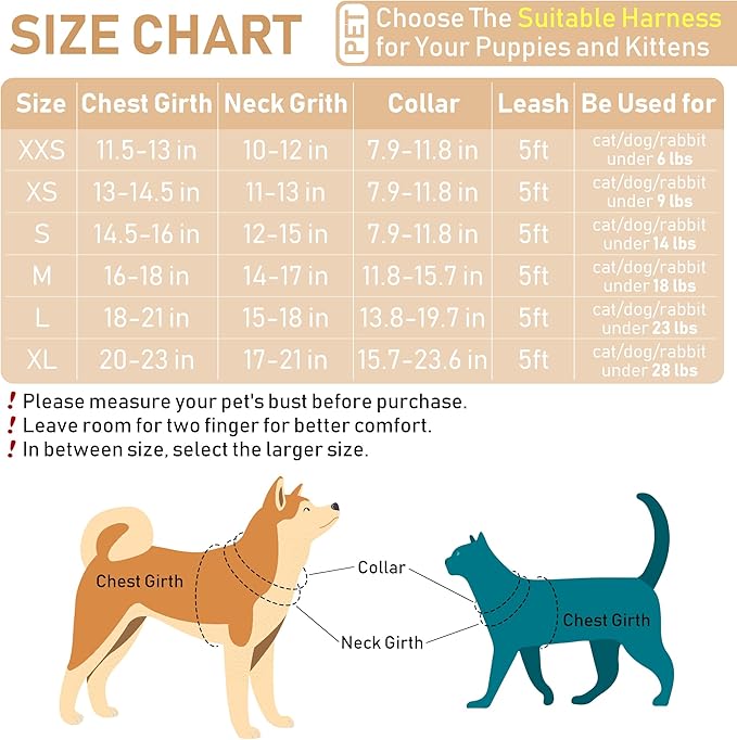 - SIZE CHART - [XXXS: Harness Chest 10"-12", Harness Neck 9"-11", Collar Length 7.9"-11.8"]; [XXS: Harness Chest 11.5"-13", Harness Neck 10"-12", Collar Length 7.9"-11.8"]; [XS: Harness Chest 13"-14.5", Harness Neck 11"-13", Collar Length 7.9"-11.8"]; [S: Harness Chest 14.5"-16", Harness Neck 12"-15", Collar Length 7.9"-11.8"]; [M: Harness Chest 16"-18", Harness Neck 14"-17", Collar Length 11.8"-15.7"]; [L: Harness Chest 18"-21", Harness Neck 15"-18", Collar Length 13.8"-19.7"]; [XL: Harness Chest 20"-23", Harness Neck 17"-21", Collar Length 15.7"-23.6"]. Please always measure your dog and refer to our brand size chart!