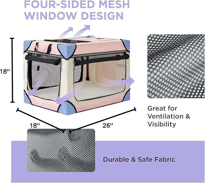 Lesure Soft Collapsible Dog Crate - 26 Inch Portable Travel Crate for Small Dogs Indoor & Outdoor, 4-Door Foldable Pet Kennel with Durable Mesh Windows, Pink