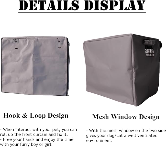 • 1 Door Crate Cover: When interact with your pet, you can roll up the front curtain of the crate door and fix it with strings. Hands free and enjoy the time with your furry boy or girl! Universal fits for most dog wire crates.