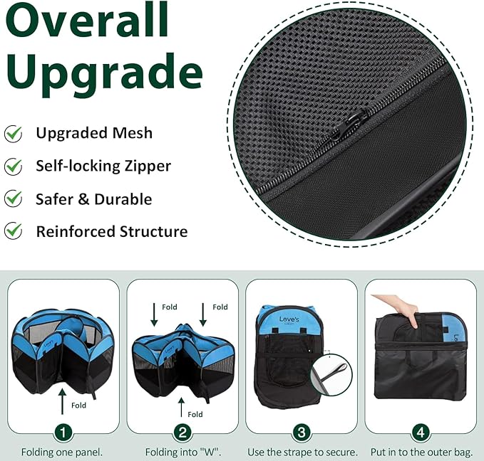 • No Assembly Required and Easy to Store: The Portable Pet Play Pen comes along with a convenient carrying case that can easily store your playpen. It takes seconds to open the dog playpen from folded storage bag, no assembly required. And it's also easy to fold back flat when not in use. Our lightweight portable pet playpen can be used indoors, outdoors, traveling, camping, etc.