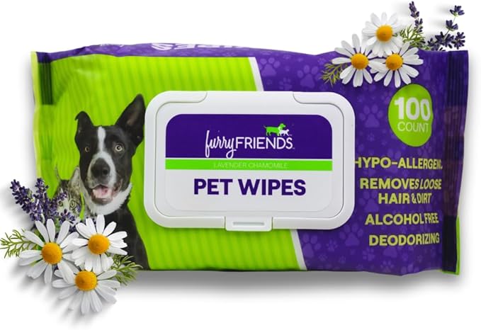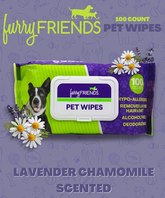 FurryFriends Pet Wipes | Lavender Chamomile Scented | Hypo-allergenic | Alcohol Free| Deodorizing | Removes Loose Hair & Dirt | Incredibly Clean | 100 ct. 1 Pack