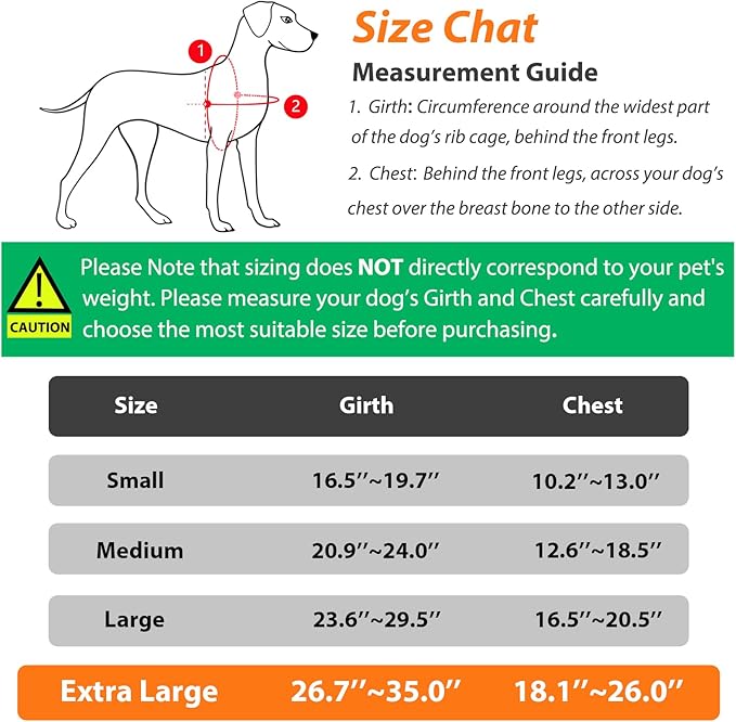 - Extra Large XL Dog Harness: For Extra Large Size Dog's [Girth:26.7''-35.0''], [Chest:18.1''-26.0'']. Please Note that sizing does NOT directly correspond to your pet's weight. Please measure your dog's girth carefully and choose the most suitable size before purchasing. This dog harness for Extra Large dogs no pull makes a perfect gift for Thanksgiving, Christmas, New Year.
