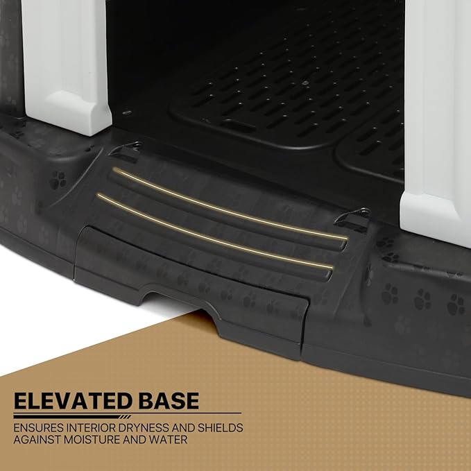 - Superior Shelter with Premium Convenience - Elevate your dog's comfort with our 3" raised base, expertly designed to fend off ground dampness and ensure a dry haven, even during rain or snow. Plus, with a removable tray and mats that easily slide out, cleaning and maintenance are a breeze, ensuring a hygienic and comfortable space for your pet.