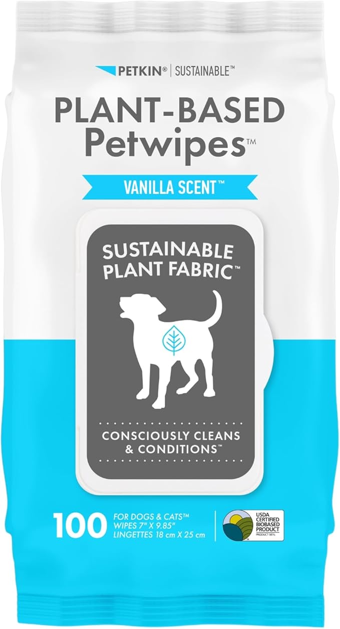 • Petkin Plant-Based Wipes For Dogs and Cats - These wipes are made with a thick and strong, USDA Certified Biobased fabric - NO synthetic materials used. So you can care for your pet while caring for the planet. Includes 1 pack of 100 wipes.