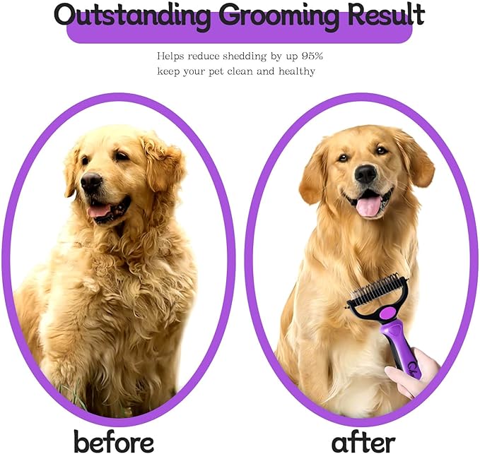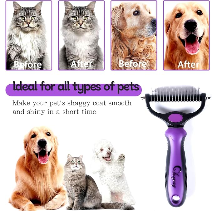 • [2-in-1 Comb]:Wide side for combing knots, smoothing and styling, dense side for removing loose hair, you can use it to comb your pet's legs, head or tail. Perfect de-shedding brush for dogs, de-shedding comb for cats, de-shedding tool for dogs.