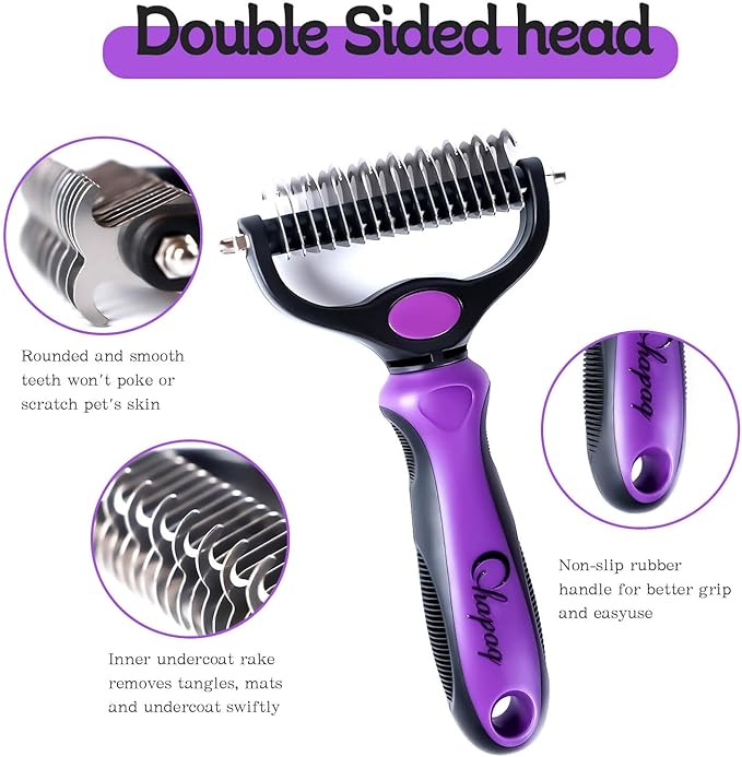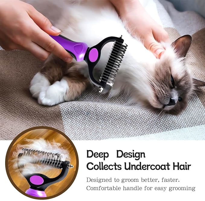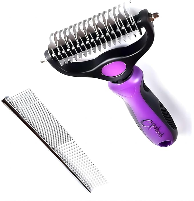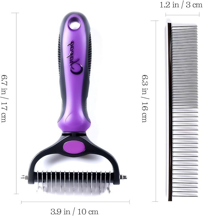 • DOG STRIPPING TOOL DESIGN】: High-quality stainless steel metal teeth and compact design make our products sturdy and durable. High quality and lightweight TPR handles provide a comfortable non-slip grip and allow you to enjoy grooming your dog's hair. Double coated high quality dog bottom rake, cat detangling brush, long hair cat brush, best detangling brush for dogs.