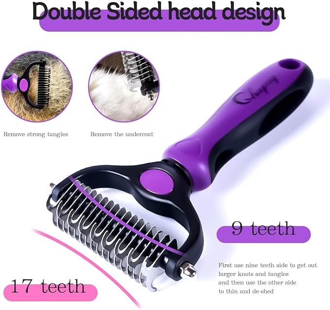 • DOUBLE SIDED BRUSH】:Our undercoat rake is perfect for cat grooming, cats and other double sided coated pets.9 fine teeth for easy removal of stubborn mats or tangles, 17 fine teeth for removal of knotted hair Well made dog shedding tools, dog hair brushes, and cat shedding brushes.
