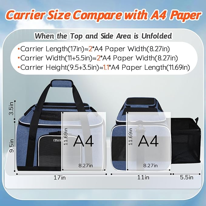 - 【AIRLINE APPROVED CARRIER 】Unfolded size:17"L×(11+5.5)"W×(9.5+3.5)"H, Petskd pet carrier is TSA approved and can be placed under the seat in the cabin, it is mainly designed for ①Alaska Airlines:17x11x9.5", but also in compliance with ②Southwest Airlines:18.5x13.5x9.5" ③Delta Airlines:18x11x11" ④United Airlines:18x11x11" ⑤American airlines:18x11x11" ⑥Air Canada:21.5x15.5x10.5". We recommend you buy this carrier when you fly with the above-mentioned airlines.When you take the carrier on airplane, please fold the top and side expansion areas for the size of airline seat.