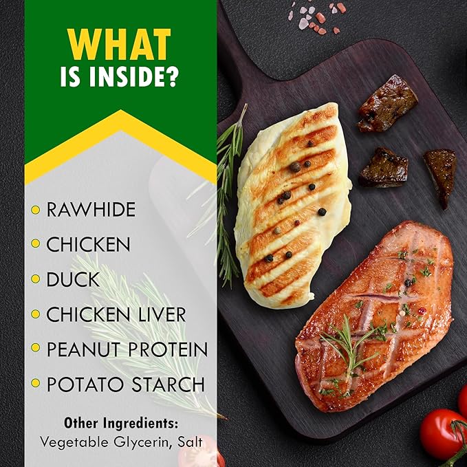 • ✅ NOURISH WITH HIGH PROTEIN from ALL NATURAL CHICKEN & DUCK: Our kabob dog treats aren't just delicious – they're packed with protein fatty acids to support your dog's skin, coat, and overall health. Say goodbye to dull coats and hello to shiny, healthy fur with every satisfying chew. Give your pup the nutritious reward they deserve while keeping their skin and coat looking their best.