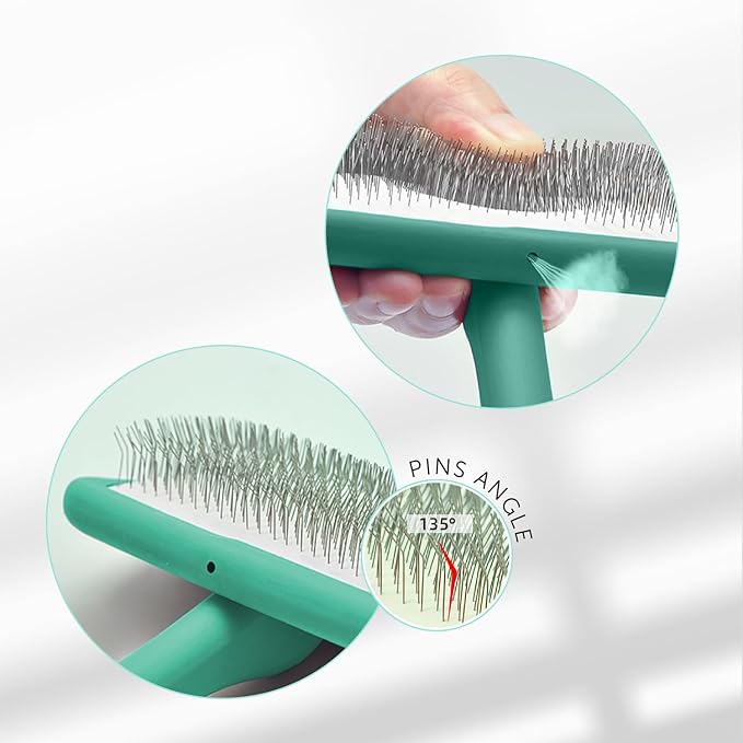 • 135° STAINLESS STEEL BRISTLES - With a curvature angle of 135°, the bristles effortlessly comb through the fur, removing loose hair and tangles. They offer a gentle massage that enhances blood circulation and stimulates hair growth.