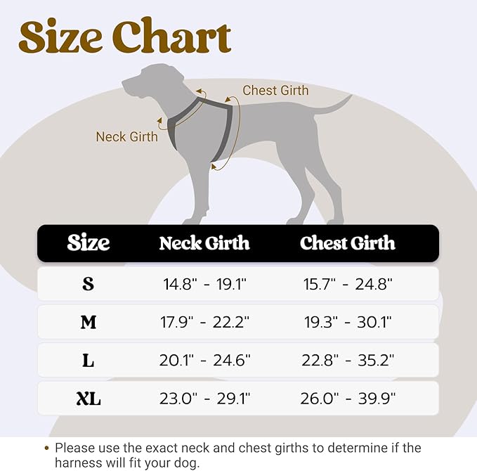 • Fully Adjustable for Customized Fit: Neck Girth: 14.8"- 19.1", Chest Girth: 15.7"- 24.8". There are 4 convenient adjustment points: 2 on the shoulders and 2 on the chest, to ensure a snug fit for dogs of all sizes. It's the ideal companion for daily walks, runs, hiking, training, hunting, and other outdoor adventures