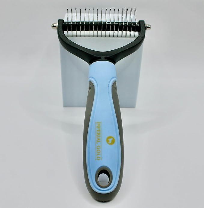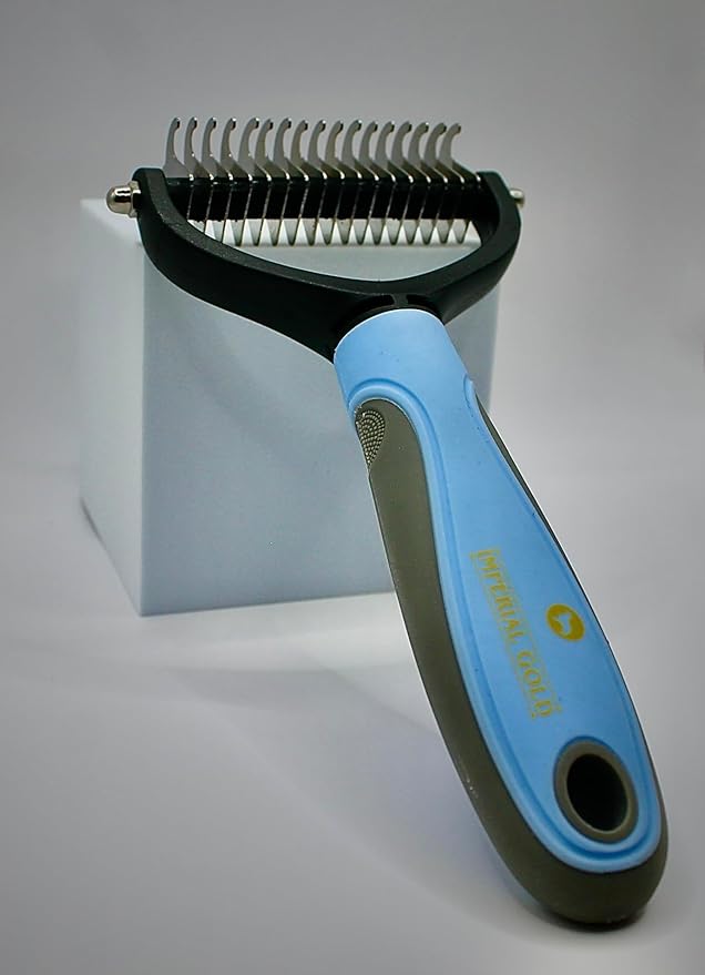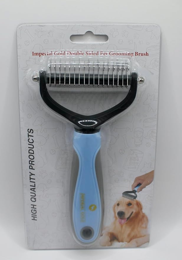 • - Imperial Gold Pet Grooming Brush: Gentle Undercoat Removal: Effectively removes undercoats and loose hair without pulling or cutting fur. - Knots and Mats Solution: Cuts through knots, and eliminates mats without scratching pet skin, easing the grooming process. - No Scratch, No Pain Design: Sharp teeth prevent hair pulling, while rounded ends ensure safety on sensitive skin.