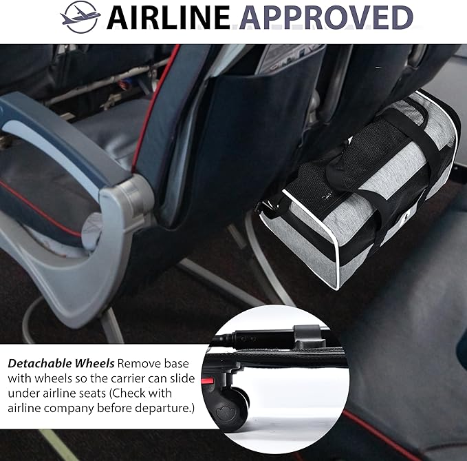 • CUSTOMIZABLE 3-IN-1 DESIGN: Our Travel Pet Carrier is a game-changer in pet travel. It seamlessly transitions from a traditional carrier to a rolling one, giving you the flexibility to choose the most convenient mode of transportation for any situation. Carry using the short straps, shoulder strap or attachable wheels.