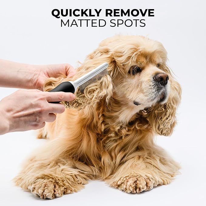 • 2-IN-1 DETANGLER COMB: Simplify the grooming process by using our dual length pet combs for dematting, detangling & combing. It features both long & short metal teeth, so it cuts time in HALF!