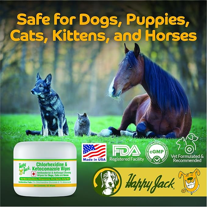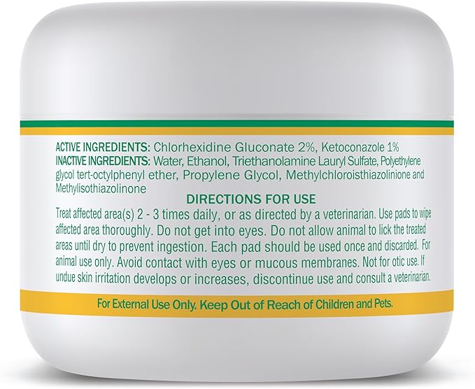 • SOOTHING DOG WIPES FOR DOGS, CATS, HORSES. Premoistened with 2% Chlorhexidine solution for dogs and 1% Ketoconazole for dogs to fight skin conditions including yeast. Used as pet wipes for dogs, dog face wipes, dog cleaning wipes, and wrinkle wipes.