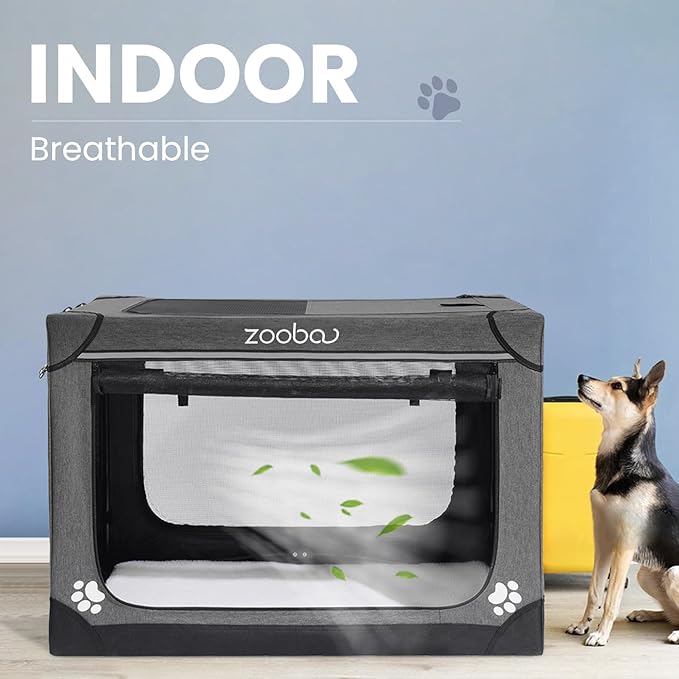 • SCRATCH-RESISTANCE: Our soft dog crate features a Textilene door – a durable material resistant to scratches from playful paws. With a specially formulated PVC coating, it ensures durability and blocks heat transfer, providing a comfortable haven for your furry friend during travel or relaxation. Opt for reliability and comfort – choose the best travel crates for large dogs