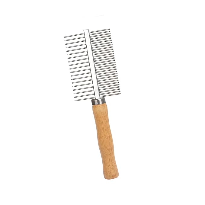 • These dog combs have two different densities of wire teeth. Wide teeth can be used for combing knotted fur, while close teeth are ideal for brushing soft hair around the eyes, ears and fine hair on the legs. Please comb the fur lightly.