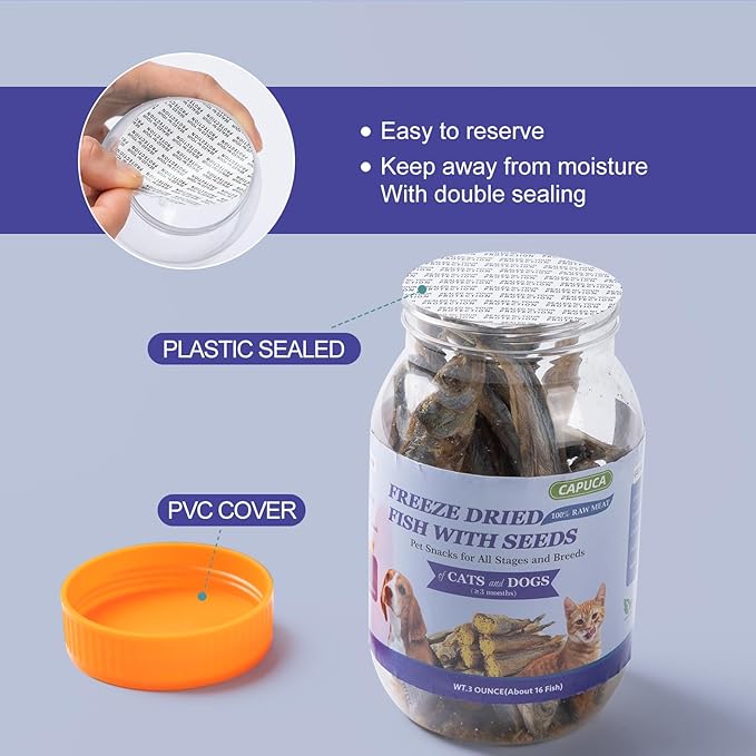 • Pure Natural: Made by 100 % premium freeze dried capelins; The freeze-drying process removes moisture from the capelins, it's free of any corn and soy; Each bottle contains approximately 16 Fish