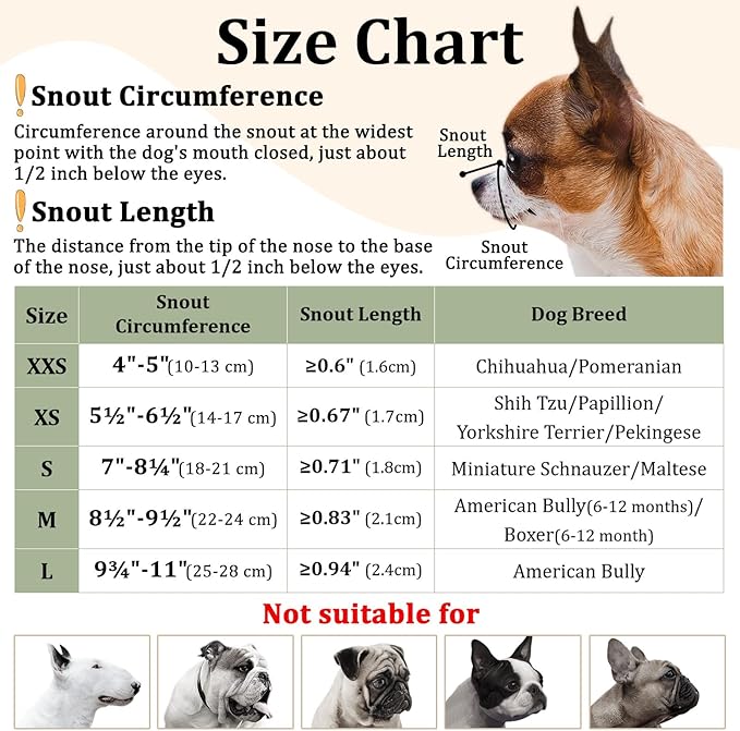 • Snug Fit for XXSmall Short Snout Dog: Muzzle for chihuahua-tailored dogs with short snouts (4-5" in circumference). Perfect for breeds like Chihuahuas and Pomeranians, ensuring the muzzle for small dog fit is comfy on your dog's nose bridge, and won't sort of push into your dog’s eyes in every wear