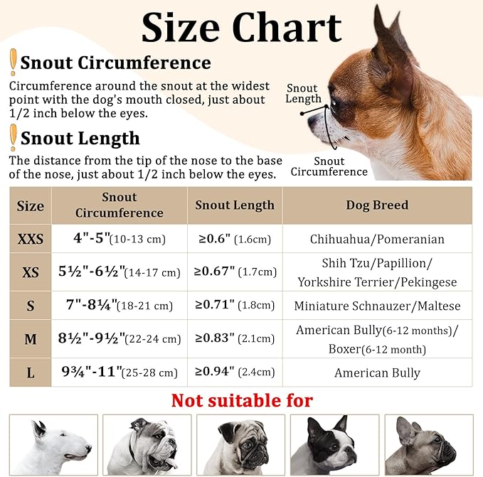 • Snug Fit for Large Short Snout Dog: Muzzle for large-sized tailored dogs with short snouts (9.75-11" in circumference). Perfect for breeds like American Bully, ensuring bully muzzle fit is comfy on your dog's nose bridge, and won't sort of push into your dog’s eyes in every wear