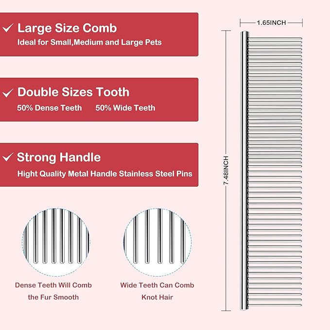 • STAINLESS STEEL COMB 2-IN-1 DESIGN - Sparse teeth to loosen tangled hair & comb large fluffy hair, also can be styled for dogs; dense teeth to comb eyes ears, nose & fine hair on legs; rounded pins with smooth stainless steel to effectively prevent static electricity & tangled hair when combing.