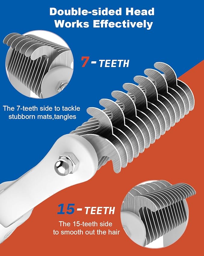 • ๐ƒ๐จ๐ฎ๐›๐ฅ๐ž-๐’๐ข๐๐ž๐ ๐”๐ง๐๐ž๐ซ๐œ๐จ๐š๐ญ ๐‘๐š๐ค๐ž ๐Ÿ๐จ๐ซ ๐ƒ๐จ๐ ๐ฌ: First, tackle the stubborn mats, tangles, and knots with the 7-teeth side; then, thin and deshed the hair and fur with the 15-teeth side