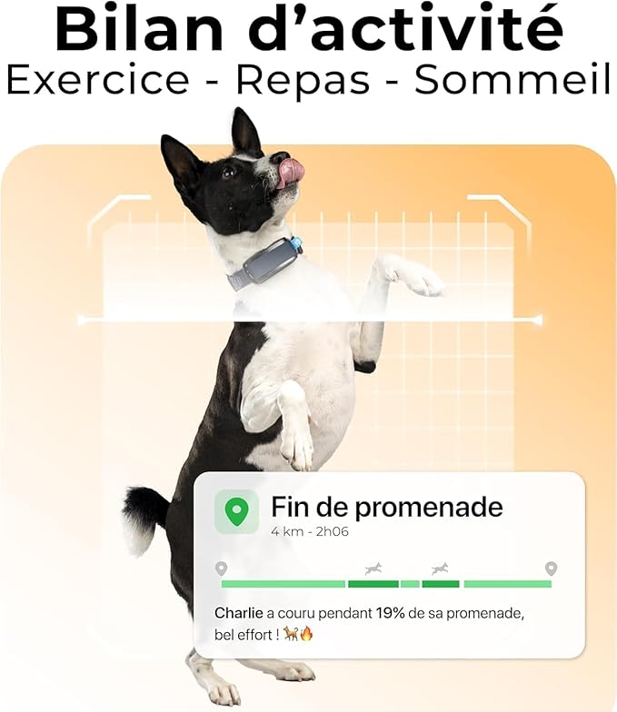 • ACTIVITY MONITORING: Ensure that its level of activity and exercise matches its needs (walking, playing, running), track its meals, and monitor the quality of its sleep.
