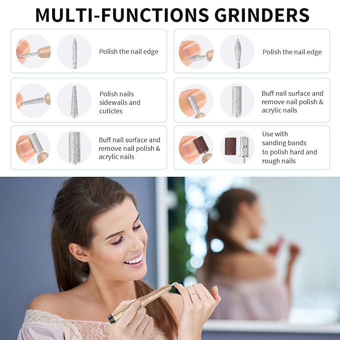 • 【Versatile Accessories for Diverse Needs】To cater to your diverse nail care requirements, our product comes with a range of interchangeable drill bits. Whether you need precise shaping, dead skin removal, or nail art, you can select the appropriate drill bit for different nail care scenarios. Achieve various nail styles effortlessly and fulfill your unique nail care preferences.