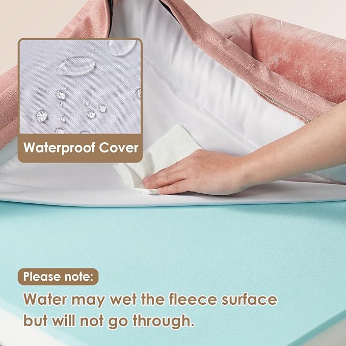 • WATERPROOF COVER: A waterproof film is positioned between the fleece surface and the bottom fabric, ensuring the dog bed remains dry. However, the faux linen sides are not waterproof.