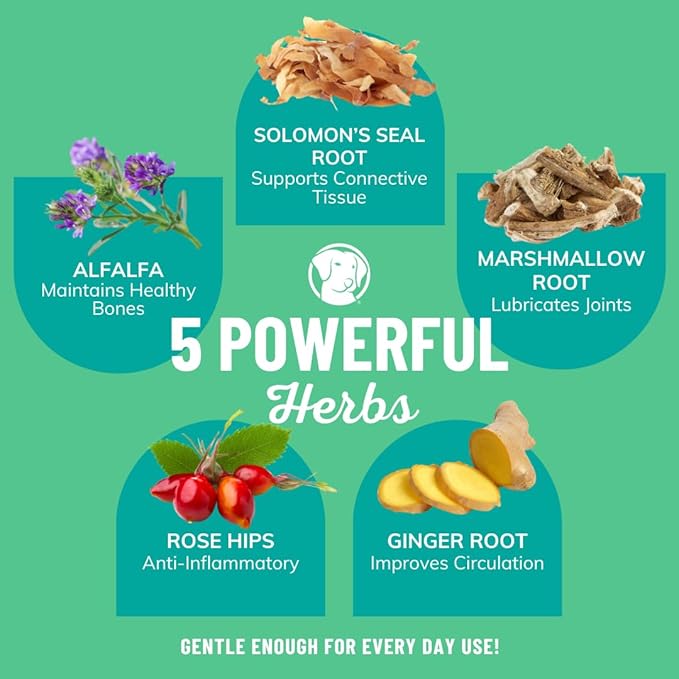 • IMPROVES JOINT HEALTH: Formulated by a top canine herbalist to serve as the ultimate hip and joint supplement. Packed with the goodness of collagen, naturally-occurring glucosamine and anti-inflammatory properties, this unique blend is designed to enhance joint health and improve your dog's mobility.