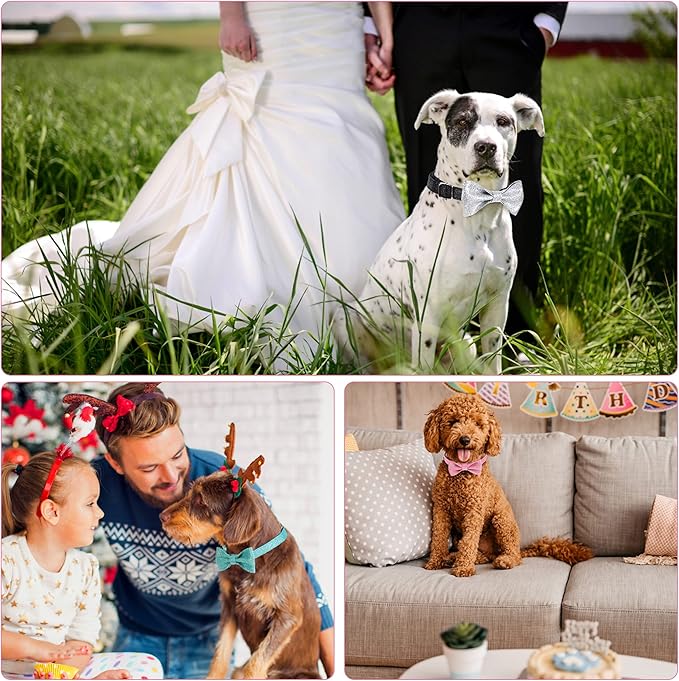 • HIGH QUALITY CONSTRUCTION -- Our bowtie dog collar with quick release metal buckle,much easy to put on and take off,thick welded D-ring provides safe attachment point for leash. Each bow is attached to collar by using two elastic straps and all handmade. The elastic positioned each side of the bow prevents it from moving around on the collar