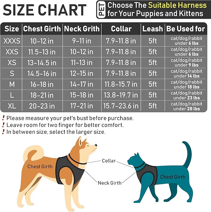 - SIZE CHART - [XXXS: Harness Chest 10"-12", Harness Neck 9"-11", Collar Length 7.9"-11.8"]; [XXS: Harness Chest 11.5"-13", Harness Neck 10"-12", Collar Length 7.9"-11.8"]; [XS: Harness Chest 13"-14.5", Harness Neck 11"-13", Collar Length 7.9"-11.8"]; [S: Harness Chest 14.5"-16", Harness Neck 12"-15", Collar Length 7.9"-11.8"]; [M: Harness Chest 16"-18", Harness Neck 14"-17", Collar Length 11.8"-15.7"]; [L: Harness Chest 18"-21", Harness Neck 15"-18", Collar Length 13.8"-19.7"]; [XL: Harness Chest 20"-23", Harness Neck 17"-21", Collar Length 15.7"-23.6"]. Please always measure your dog and refer to our brand size chart!
