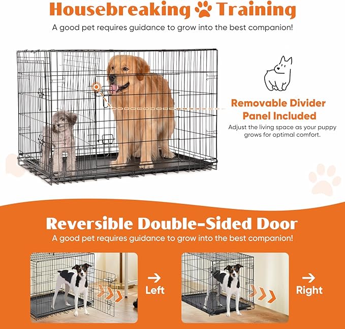 Sweetcrispy Dog Crate with Divider Panel, 48 Inch Double Door Folding Metal Wire Dog Cage with Plastic Leak-Proof Pan Tray, Extra Large Pet Kennel for Indoor, Outdoor, Travel
