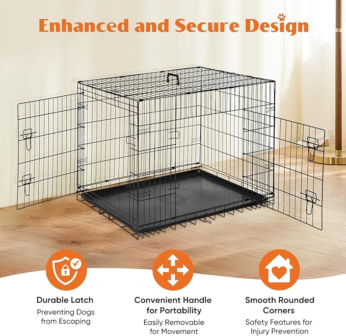 • ENHANCED SECURITY: With rounded edges, smooth rounded corners and matching accessories, our dog crates prioritize safety. Thick metal mesh and double doors with 2 heavy-duty sliding bolt locks not only prevent your dog from escaping, but also provide optimal protection for your pet;