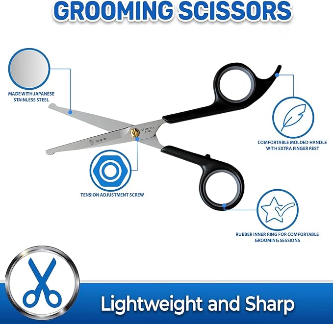 • A complete pet-grooming set with 2 pairs of scissors: a longer pair with smooth blades for trimming body fur, and a smaller pair with micro-serrated blades for close work on your pet's face and paws