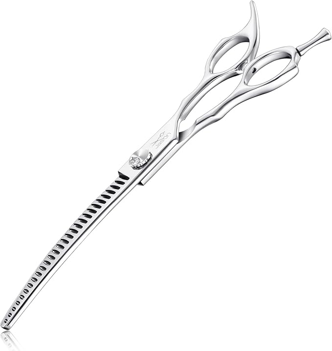 • New Design: Curved chunkers for dogs are the newest addition to dog grooming shears. The big‘T’ shaped teeth allow hair to be pushed away from the cutting blade, giving a much softer and natural finish. Equipped with 28 teeth,this dog shears deliver professional results with 60%-65% thinning rate.