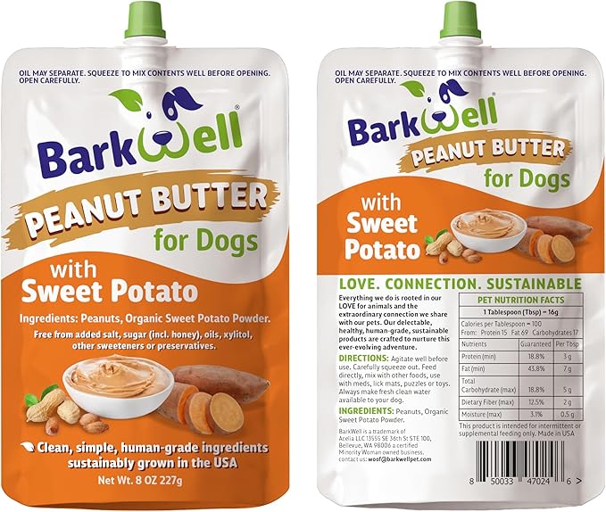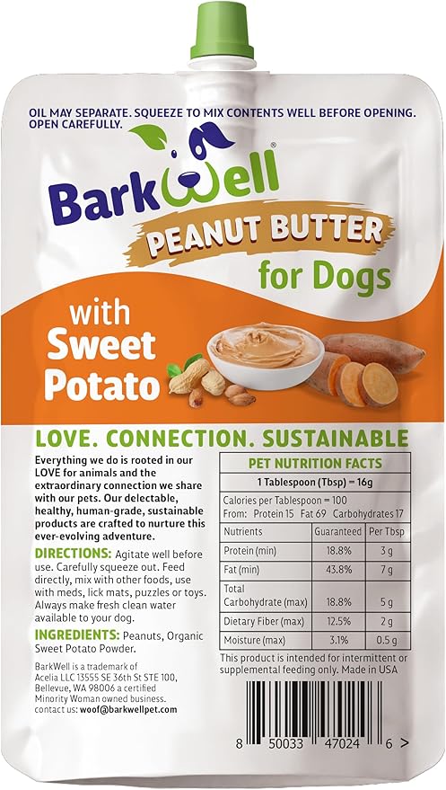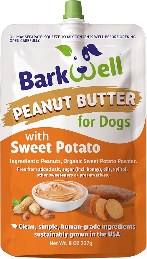 Peanut Butter Squeeze - 8oz Pouch Sweet Potato All-Natural Dog Peanut Butter, Sourced and Made in The USA