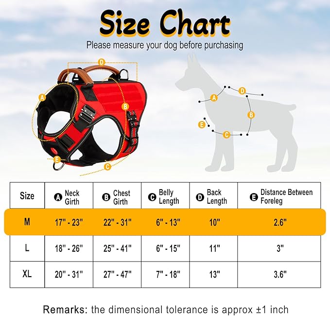 - [Dog Harness for Medium Large Dogs] - A professional tactical dog harness has 5 adjustment locations to allowing you to achieve a secure and comfortable fit for your dog's body shape. Neck Girth: 17”- 23”(43 - 58cm), Chest Girth: 22” - 31” (56.5-79.5cm), Back Length: 10”(25cm). Please refer to our size chart, make sure match up your dog's measurement