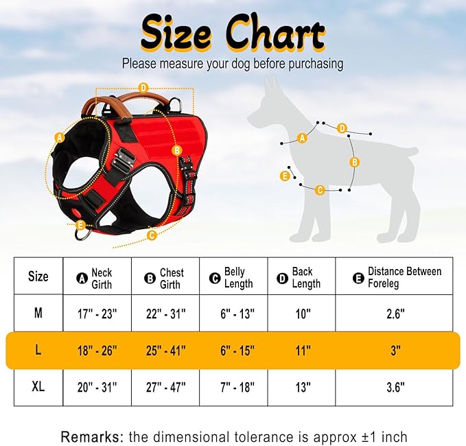 - [Dog Harness for Medium Large Dogs] - A professional tactical dog harness has 5 adjustment locations to allowing you to achieve a secure and comfortable fit for your dog's body shape. Neck Girth: 18”- 26” (47 - 66cm), Chest Girth: 25”- 41” (64 - 103cm), Back Length: 11”(28.5cm).Please refer to our size chart, make sure match up your dog's measurement