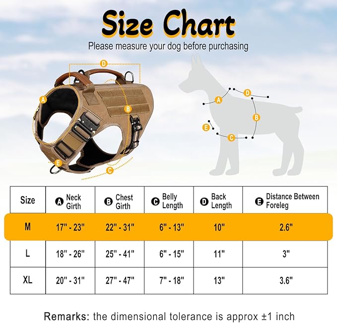 - [Dog Harness for Medium Large Dogs] - A professional tactical dog harness has 5 adjustment locations to allowing you to achieve a secure and comfortable fit for your dog's body shape. Neck Girth: 17”- 23”(43 - 58cm), Chest Girth: 22” - 31” (56.5-79.5cm), Back Length: 10”(25cm). Please refer to our size chart, make sure match up your dog's measurement