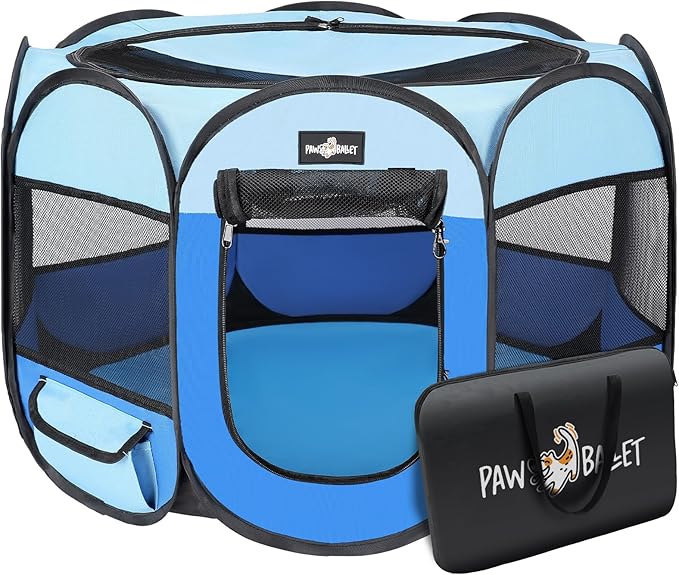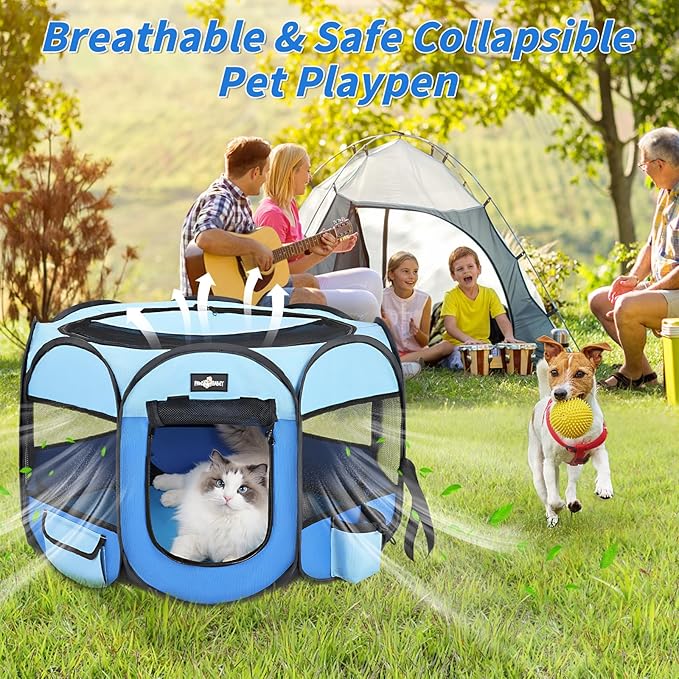 - PORTABILITY & STORAGE: Portable pet playpen comes with a convenient carrying case, folding into a compact size for easy storage in suitcases, car trunks, or closets. Perfect for indoor use, lawns, beaches, parks, traveling, and camping! Pet playpen for small dogs helps pets adapt to new environments while preventing other animals from entering, ensuring your pet's comfort in any setting.