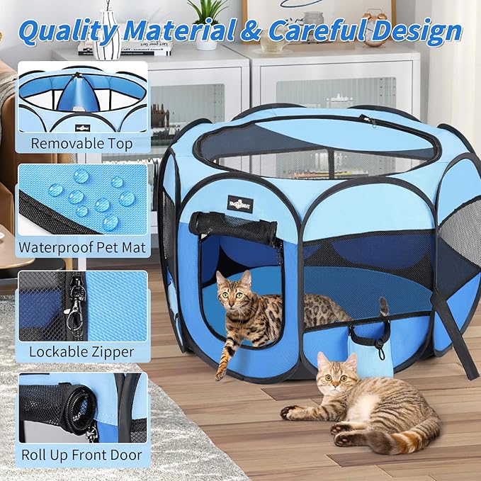 - EASY TO CLEAN & ASSEMBLE: The bottom of the kitten playpen indoor is waterproof, and it comes with a waterproof Pad, easily wiped clean or washed with water, and air-dried for continued use. Adding a blanket underneath is an option for easy cleaning. No tools or assembly is required for the pet playpen for cats installation; the pop-up design ensures quick setup in seconds and folds just as quickly when not in use.