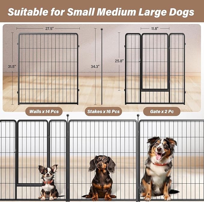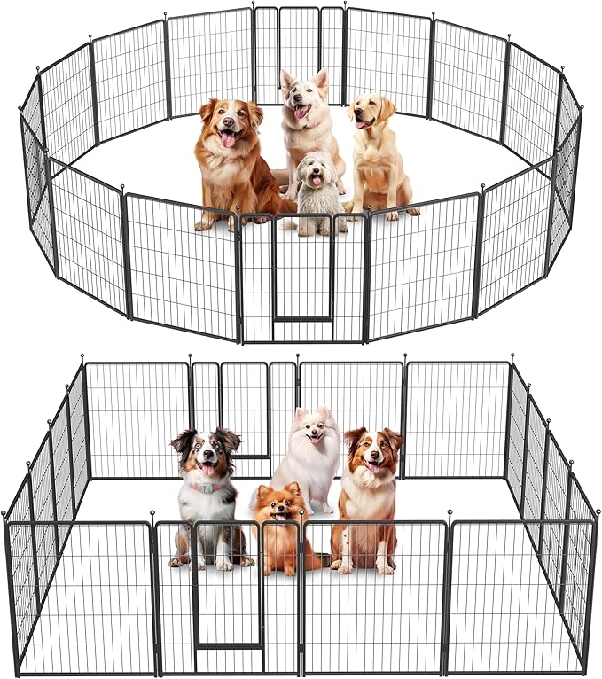 • 【Iron Fence】 The 16 panel dog playpen indoor fence is made of iron and coated with black rust proof coating. The metal playpen is free-standing, but if you have a mischievous puppy, you might secure the playpen to the ground firmly for double safety.