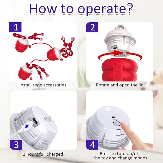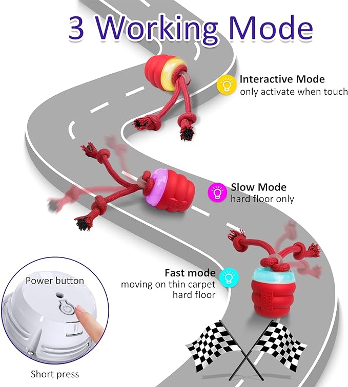 • How to use? Screw out the outer case to see the power button. Press first, power on and dog ball rolls in fast mode(blue light), change working mode by short press. Slow mode(purple light),Interactive mode(yellow light).Add the stronger rope on help balls rolls well, or you could DIY others special tails