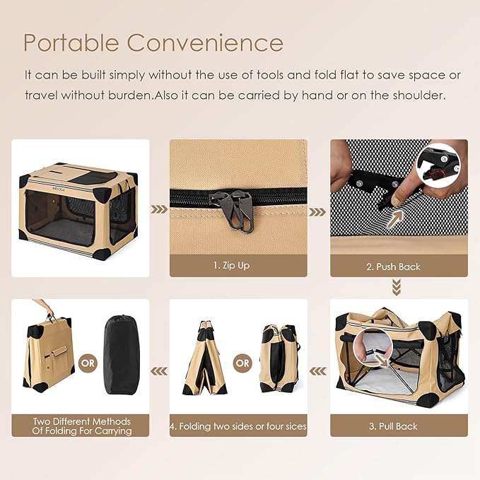 EHEYCIGA Collapsible Dog Crate 30 Inches, Portable Travel Crate for Medium Dogs, Soft Foldable Pet Kennel with 4-Door Mesh Windows Indoor & Outdoor, Beige