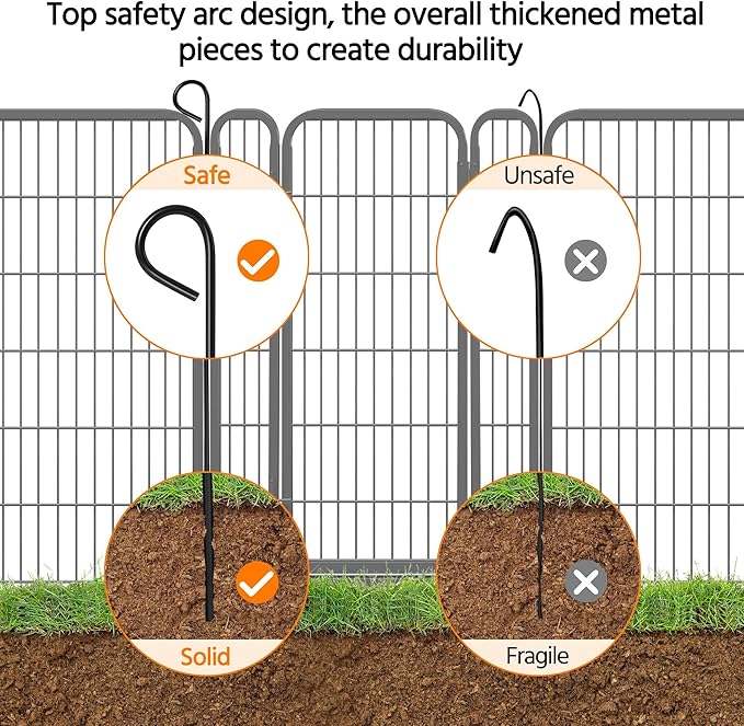 • Solid Metal Stakes Ensuring Safety: The upgraded solid metal stakes achieve a fully enclosed bend, avoiding sharp edges and ensuring your animals play safely. At the same time, the solid stakes are easily inserted into the ground to keep the walls more stable and rigid when the dogs exercise