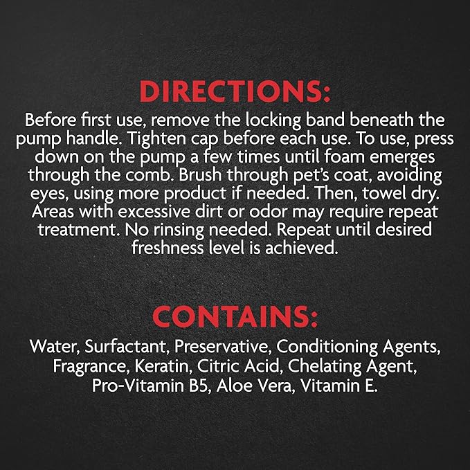 • RINSE-FREE FOAM COMB: Easy-to-use comb with foaming shampoo helps freshen your pet’s coat without water.