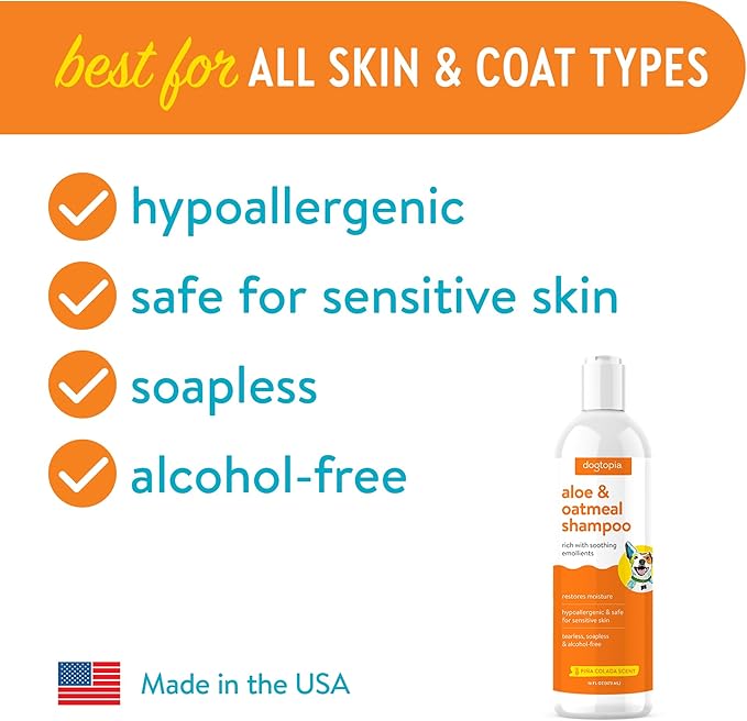 • Made in the USA, Dogtopia’s Aloe and Oatmeal Shampoo is hypoallergenic, safe for sensitive skin, tearless, soapless, and alcohol-free, making it perfect for everyday use.