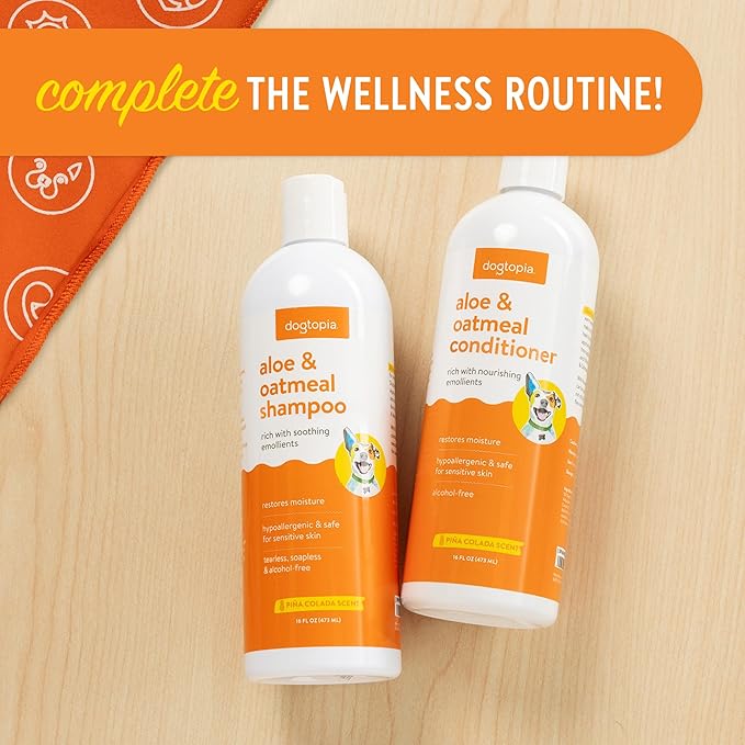 • With its gentle formulation and tropical piña colada scent, Dogtopia’s Aloe and Oatmeal Shampoo will keep your pet clean, healthy, and smelling fresh.